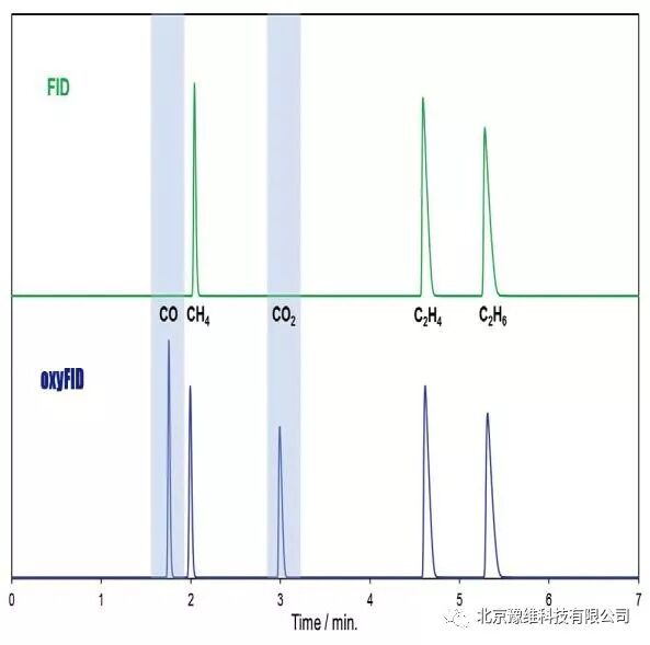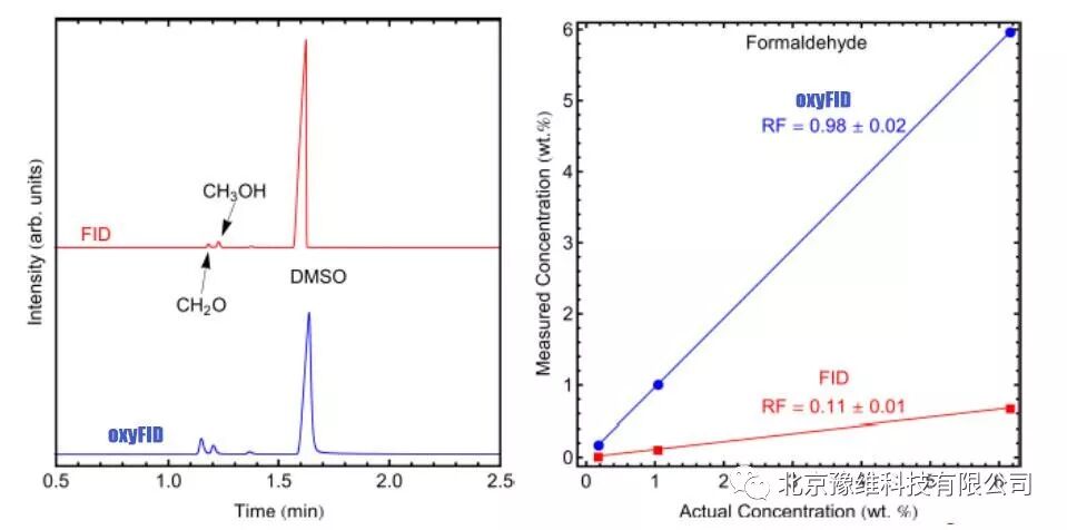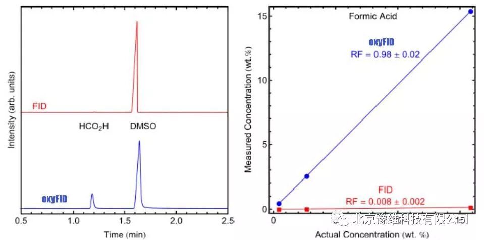 由上图对比情况可知,甲酸于FID的RF值为0.008,而于oxyFID上的RF值为1,从而得到差异巨大的色谱图,由色谱图的对比情况可知,在FID上基本无响应,而在oxyFID上确可得到极佳的色谱图。