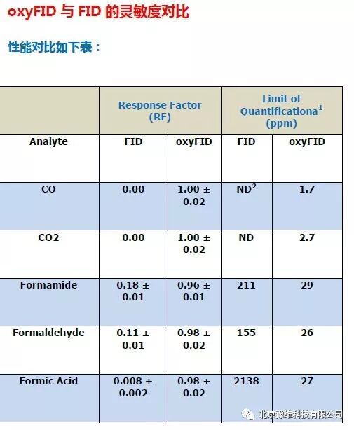 oxyFID有效的打破了原FID检测器的局限性,对于FID无法检测或者灵敏度极低的物质(如CO、CO2、COS、HCN、CH3NO、甲醛、甲酸等),可进行高效检测。